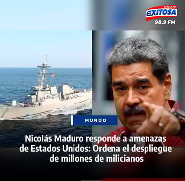 🔵🔴 #ExitosaChiclayo | Como medida de defensa a las amenazas de Estados Unidos, que puso una recompensa de 50 mil dólares por Nicolás Maduro, el mandatario respondió. El presidente de Venezuela dispuso el despliegue de 4,5 millones de milicianos en todo el país, ante el envío de destructores estadounidenses cerca de sus costas.