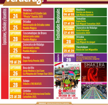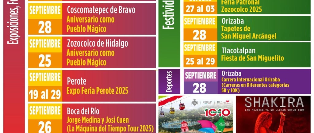 En Exposiciones, Festivales y Encuentros, Boca del Río será sede de grandes presentaciones: el día 24, Shakira actuará en el Estadio Luis Pirata Fuente y, dos días después, Jorge Medina y Josi Cuen encenderán el escenario del Beto Ávila; el 25 Orizaba celebrará su aniversario como Pueblo Mágico.